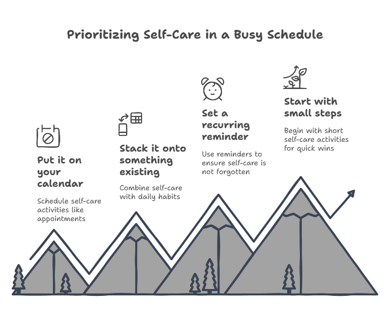 It’s easy to treat self-care as an extra—something you’ll get to when everything else is done. The problem? Everything else is never done. Life is always going to be busy, and if you wait for the “right time” to take care of yourself, it’ll never happen.